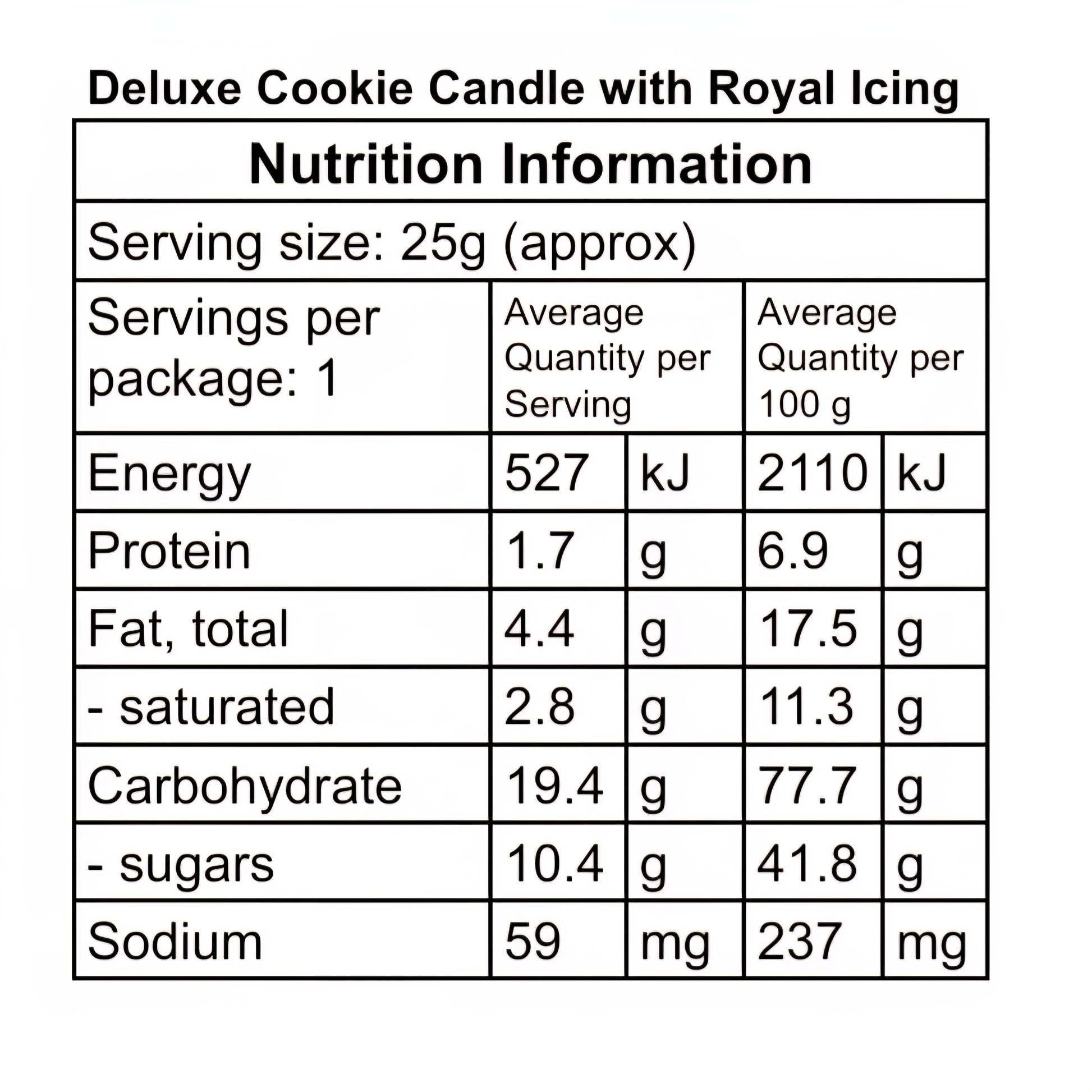All-purpose flour (wheat), sugar, butter (from milk), egg, potato starch, tapioca flour, pea protein, raising agent (500), stabiliser (461), (sulphites), vanilla essence, cocoa butter, water, potato starch, glucose syrup, glycerine, thickeners (413, 466), (preservative) potassium sorbate, citric acid, emulsifier (472c), natural flavours and artificial colours. Contains sulphites, gluten, dairy and eggs. May contain traces of tree nuts and other common allergens. Made in Melbourne in a registered kitchen by Cookie Candles.