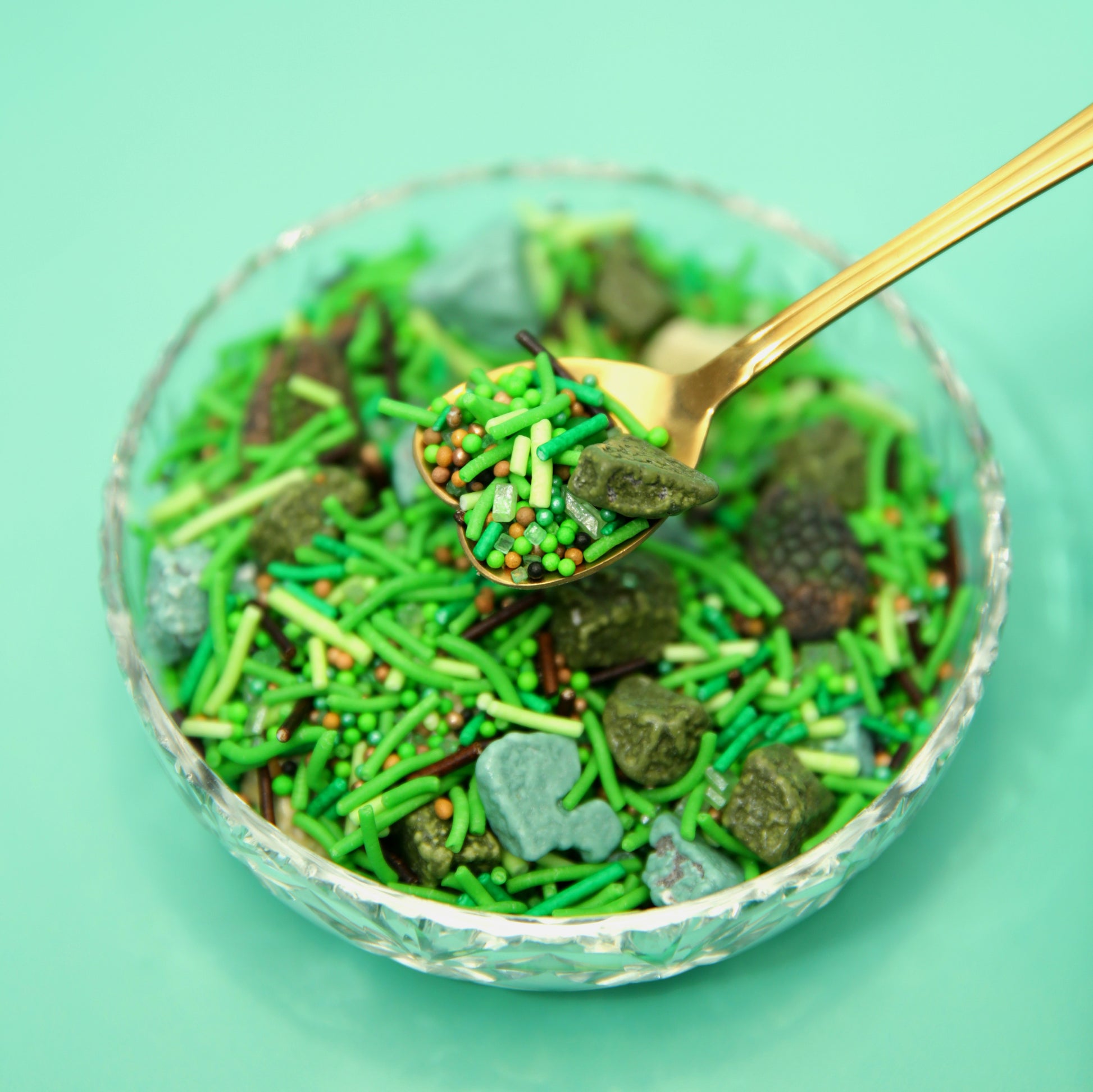 Romp-omp-a-stomp! Are you constructing/hacking a dinosaur themed birthday cake? After a dinosaur habitat? This sprinkle blend creates the perfect ground for any prehistoric life. It even includes chocolate rocks! If you're lucky, you may even find a couple fondant dino eggs hiding in there too.